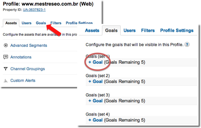 Na sequência, visite a aba Goals e clique em +Goal para criar um novo Goal, ou altere um que você já tenha configurado previamente e deseja montar um funil: