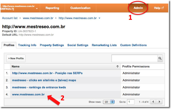 Sendo assim, vamos até a página de criação de meta para podermos fazer o funil de conversão. Tudo começa acessando a área de administração da conta e depois o perfil do site que terá o funil monitorado: